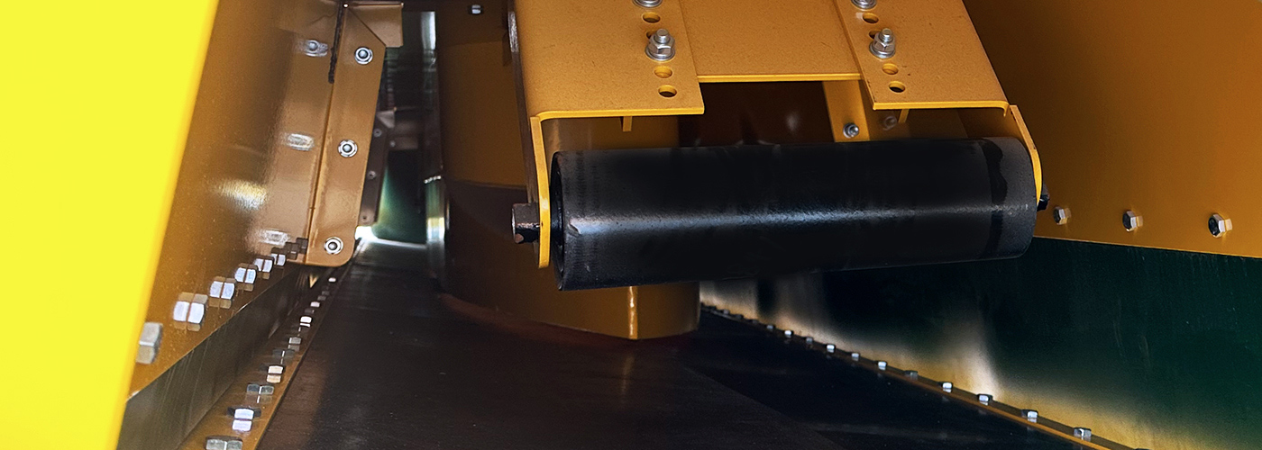 拉鏈式蓋帶機以搭接形式沿帶式輸送機布置兩塊傾斜彈性蓋帶,船型拉鏈機構插入蓋帶下方,隨上方輸送設備卸料點變化而靈活運動,實現進料。
